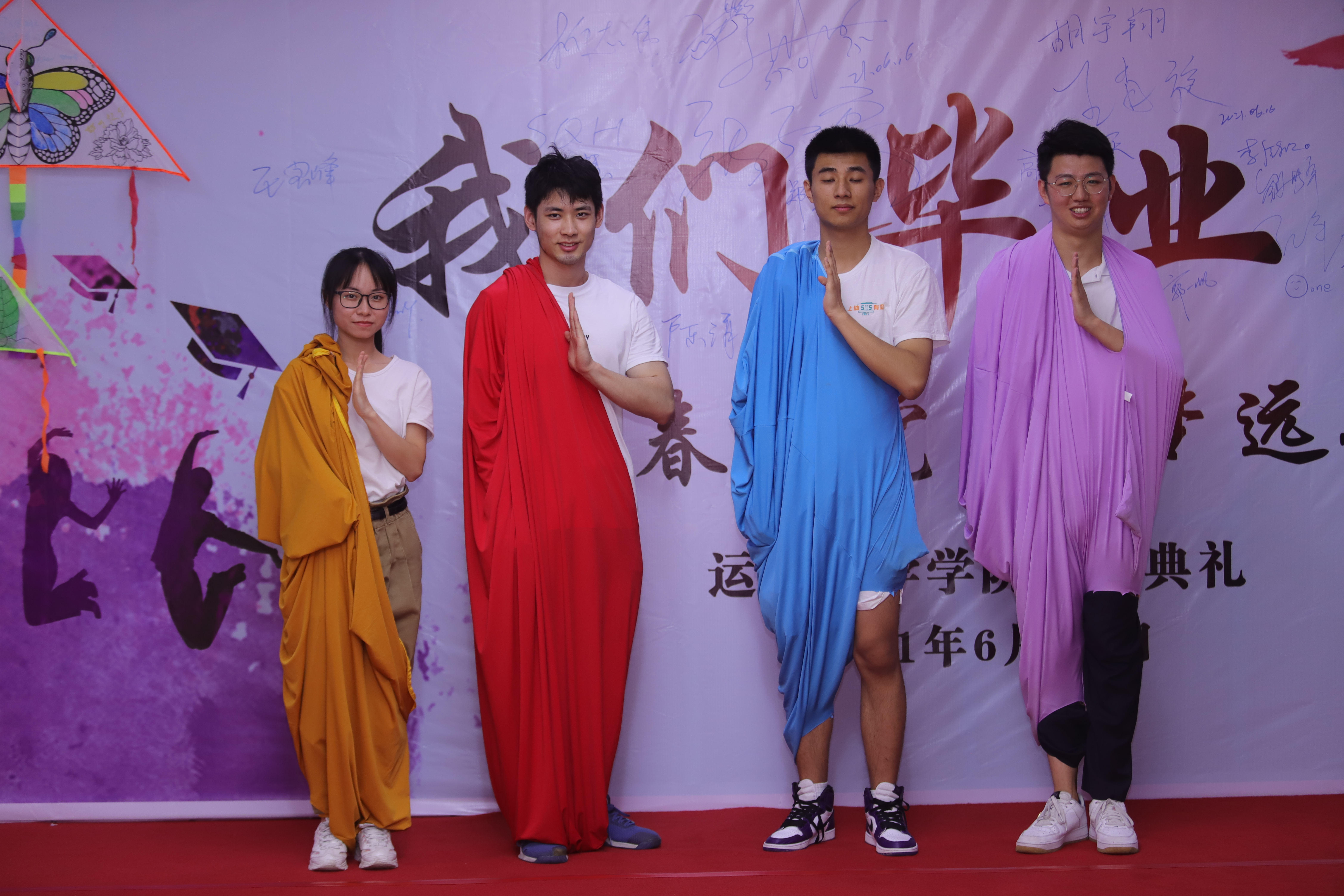 中午,在图文信息楼前,毕业生们纷纷踏过红地毯、走到签名墙前,签下自己的姓名,并留下了属于自己的最美身影。旁边的报告厅里不断循环播放着温暖轻快的毕业歌曲,处处都营造出毕业季的温情氛围和仪式感。