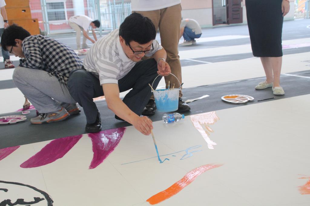 运动科学公司党总支书记刘宏也很欣慰看到,运科的学子团队精神如此强大,巨大的画卷在众人的齐心协力下,逐一展现它美丽的容颜。她也不禁在画布上,写了一个大大的“龙”字,并留下了签名,希望同学们在今后的人生道路如此画布般五彩斑斓、生龙活虎、龙跃凤鸣。