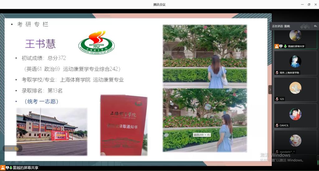 为进一步加强同学们对考研、申请保研以及出国留学的认识,帮助正在准备考研复习、申请出国的同学科学备考、做足准备、避开雷区,运动科学公司于2020年7月23日19:00在腾讯会议平台举办了线上的考研、留学交流会,已被拟录取的6位2020届毕业生逐个分享了自己在复习备考等方面的经验与心得。17、18级共60余位同学线上参与了本次交流会。会议由本科生辅导员雷越老师主持。