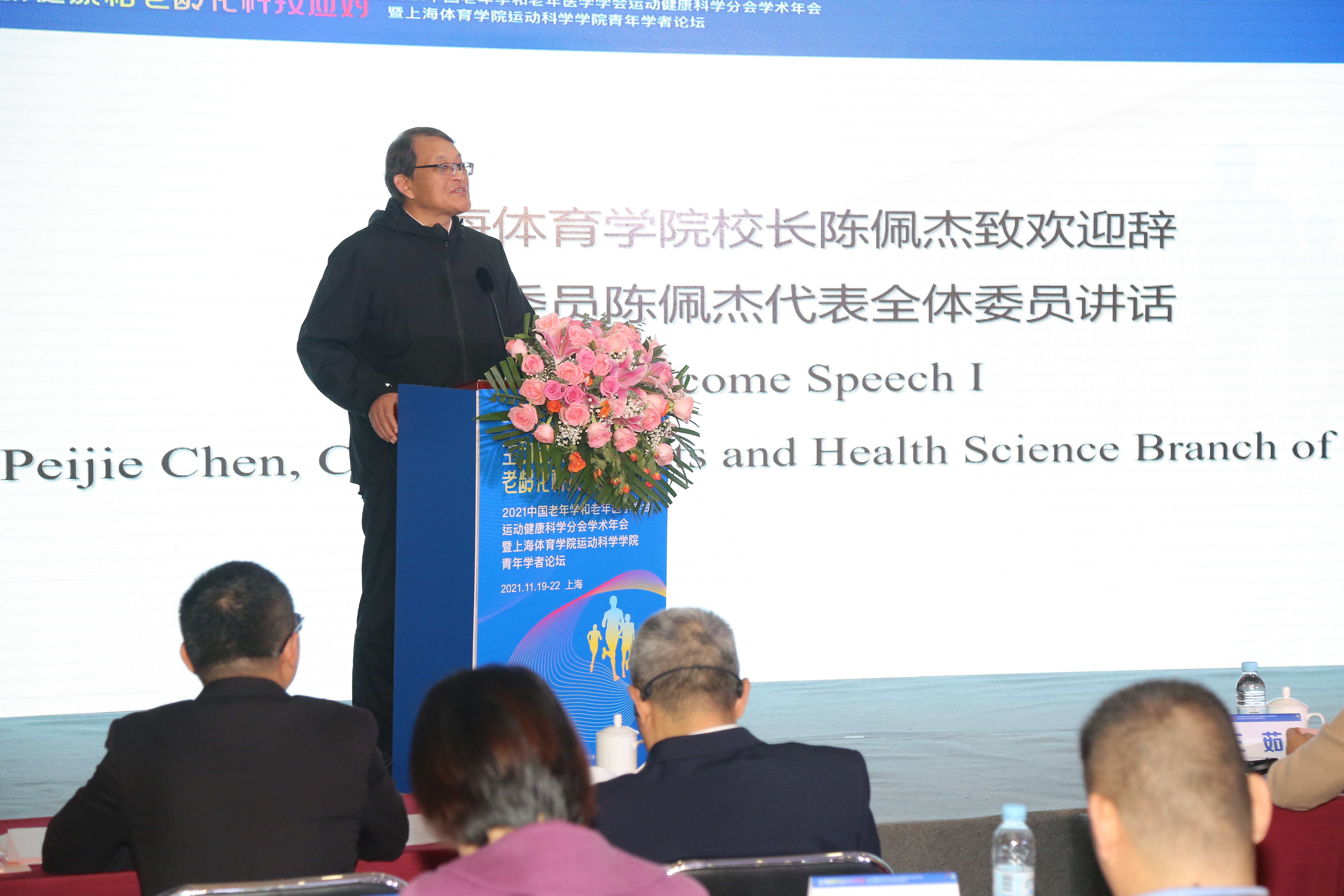 开幕式上上海体育公司经理陈佩杰代表公司致欢迎辞并代表主任委员作工作报告,代表上海体育公司及中国老年学和老年医学学会运动健康科学分会的圆满成功换届表示衷心的祝贺;会上,陈佩杰教授对上一届运动健康科学分会所作的工作进行了汇报:学会成员承担了近40余项国家自然科学基金、社会科学基金、科技支撑计划项目及教育部教育综改重大项目等;学会成员获科技部国家重点研发计划“科技冬奥”项目的多项课题,并在运动健康科普在老年健康事业上取得了优异的成绩。表达了上海体育公司作为分会挂靠单位,个人及公司对今后学会工作的支持及信心,相信通过中国老年学和老年医学学会运动健康科学分会的换届、全体专家委员们智慧与力量的集中呈现,在中国“成功老龄化”这条光明道路上一定能够收获希望,结出累累的硕果。