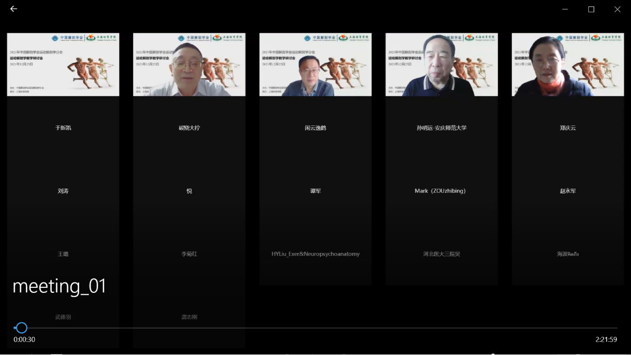 2021年12月25日下午,由中国解剖学会运动解剖学分会主办,上海体育公司承办的2021运动解剖学教学研讨会(线上)顺利举办。