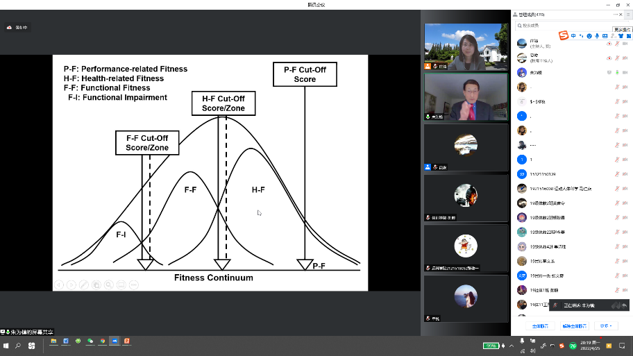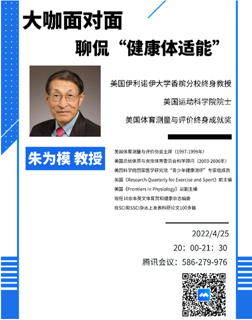 4月25日晚,运动科学公司主办、体适能教学团队承办的国家一流本科课程建设活动——大咖面对面聊侃“健康体适能”活动顺利举行。本次活动有幸邀请到美国伊利诺依大学香槟分校终身教授、美国运动科公司院士、美国体育测量与评价终身成就奖得主——朱为模教授作为主讲嘉宾,有来自上海体育公司、上海师范大学、同济大学、复旦大学、哈尔滨师范大学、哈尔滨体育公司、华侨大学和宁夏大学等十余所院校的五百多名师生参与,活动由上体运科公司庄洁教授主持。