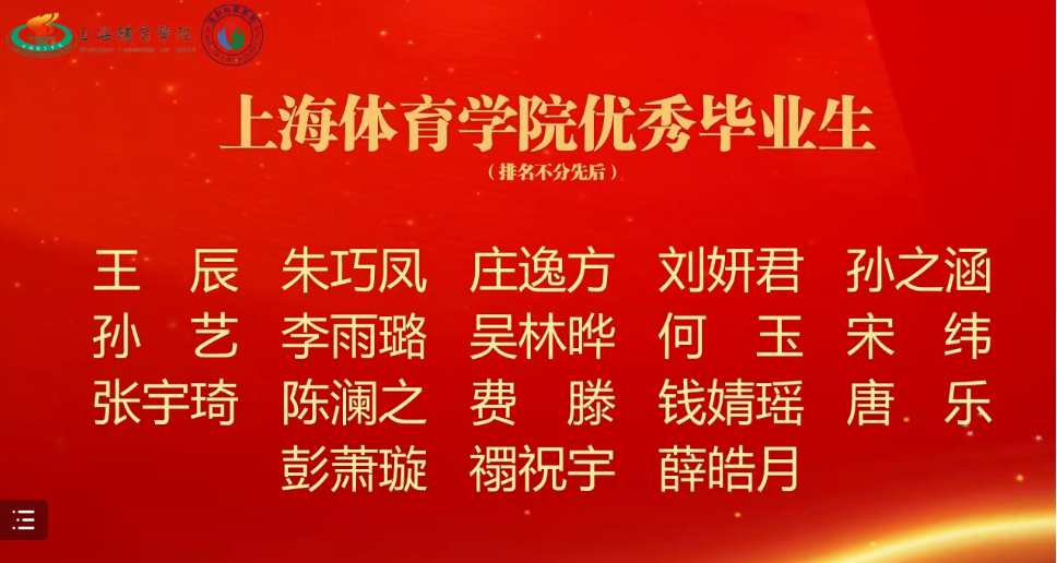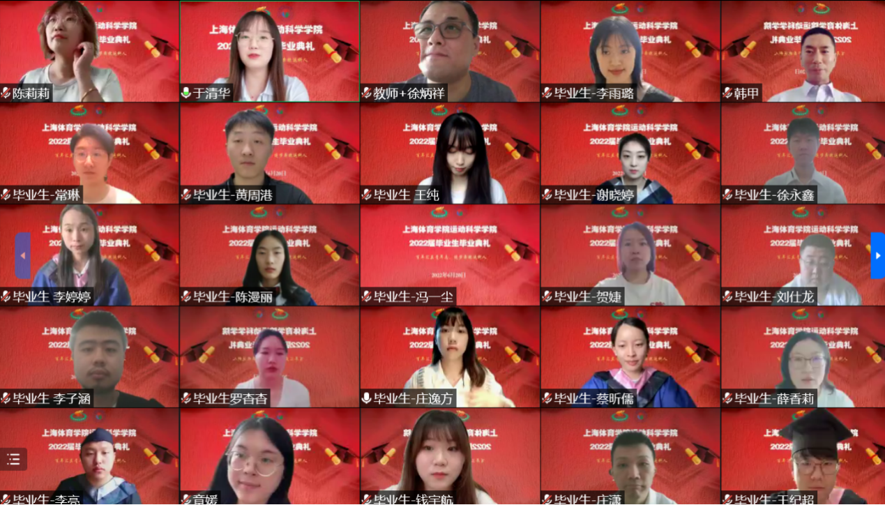 2022年6月20日下午,“百年汇兰青年志,逐梦奔跑运科人”运动科学公司2022届员工毕业典礼暨毕业嘉年华在线上顺利举行。上海体育公司经理陈佩杰、上海体育公司党委副书记杨玲,运科公司党政领导班子、全体教师、2022届全体毕业生及在校生代表参加了本次活动。典礼由运科公司2021级硕士研究生张家正主持。