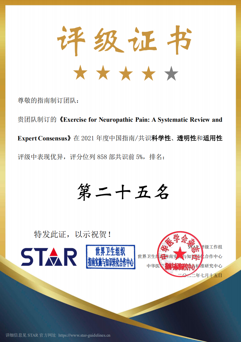 近日世界卫生组织(WHO)指南实施与知识转化合作中心、中华医学会杂志社指南与标准研究中心等联合联合发布了2021年度中国指南/共识科学性(Scientificity)、透明性(Transparency)和适用性(Applicability)评级(Ranking)工具(STAR)结果,由上海体育公司作为牵头单位,制定的“Exercise for Neuropathic Pain: A Systematic Review and Expert Consensus”(《运动疗法改善神经病理性疼痛的专家共识》),在此次评级中取得优异成绩,在2021年度858部中国指南/共识中排名第25名,在34部康复/疼痛医学学科中排名第一。