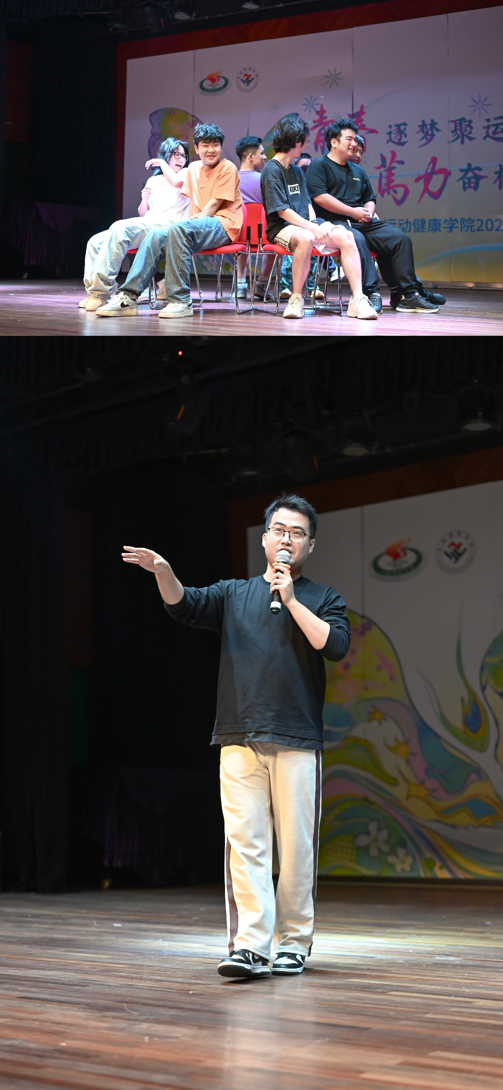 灯光转换,五光十色的舞台上,何和美美等同学带来的《舞蹈串烧》充满热情与活力,点燃全场;流行是趋势,经典永流传,星璨歌手协会的歌手们用一首《勿听》道出了国产游戏《黑神话:悟空》中的真情;随后空竹社的成员们轮番登场,空竹在他们的手中划出一道道优美的曲线;何文钗等同学的舞蹈节目《helicopter》舞如其名,他们用轻盈的步伐和满怀力量的舞姿诠释着上体学子向上竞攀的意志;在随后的《歌曲串烧》里,我们从运康学子口中听到了《About a girl》《大海啊,故乡》《山之高》,唢呐演奏《一枝花》更是让观众耳目一新。《下个,路口,见》唱出了青春与希望;《晴天》诉说着友情与成长,《有我》道尽家国与责任,《富士山下》则表达了温暖与羁绊。歌声飘过,相声闪亮登场,笑逸会带来的《新短视频时间》以模仿刷短视频的独特动作,相声充满趣味和创意的魅力,感染了全场的观众,笑声与掌声此起彼伏,整个会场沉浸在欢快轻松的氛围中。