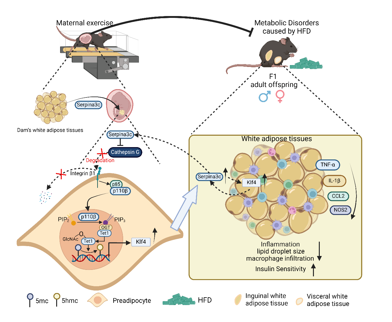 母亲孕期运动作为一种改善子代代谢健康的有效干预手段,近年来引起关注。母亲孕期运动不仅能够增强其子代骨骼肌的运动耐力,还可以调控其子代肝脏中葡萄糖代谢相关基因的表达,进而改善子代的代谢健康。然而母亲孕期运动对子代白色脂肪组织(WAT)的代谢有怎样的影响及其分子机制尚不清楚。SERPINA3C是一个近年来新发现的脂肪因子,可以促进小鼠脂肪组织代谢健康,缓解脂肪肝、动脉粥样硬化等代谢性疾病。郭亮教授团队利用C57BL/6J小鼠模型进行研究发现,孕期运动能够增强孕鼠WAT中SERPINA3C的表达和分泌,进而提高胎鼠循环系统中SERPINA3C蛋白的水平。SERPINA3C在胎鼠前体脂肪细胞中通过调控Cathepsin G/Integrin β1/磷酸肌醇-3-激酶(PI3K)/O-GlcNAc转移酶(OGT)/Tet甲基胞嘧啶双加氧酶1(Tet)轴,促进Klf4基因启动子的DNA去甲基化,从而维持子代脂肪组织中Klf4的较高水平表达,抑制高脂饮食(HFD)喂养子代小鼠的脂肪组织炎症、抵抗代谢紊乱。这一发现不仅丰富了人们对母亲运动促进子代代谢健康分子表观遗传机制的认识,还为改善静坐生活方式母亲所生子代的代谢健康提供了潜在的干预靶点。