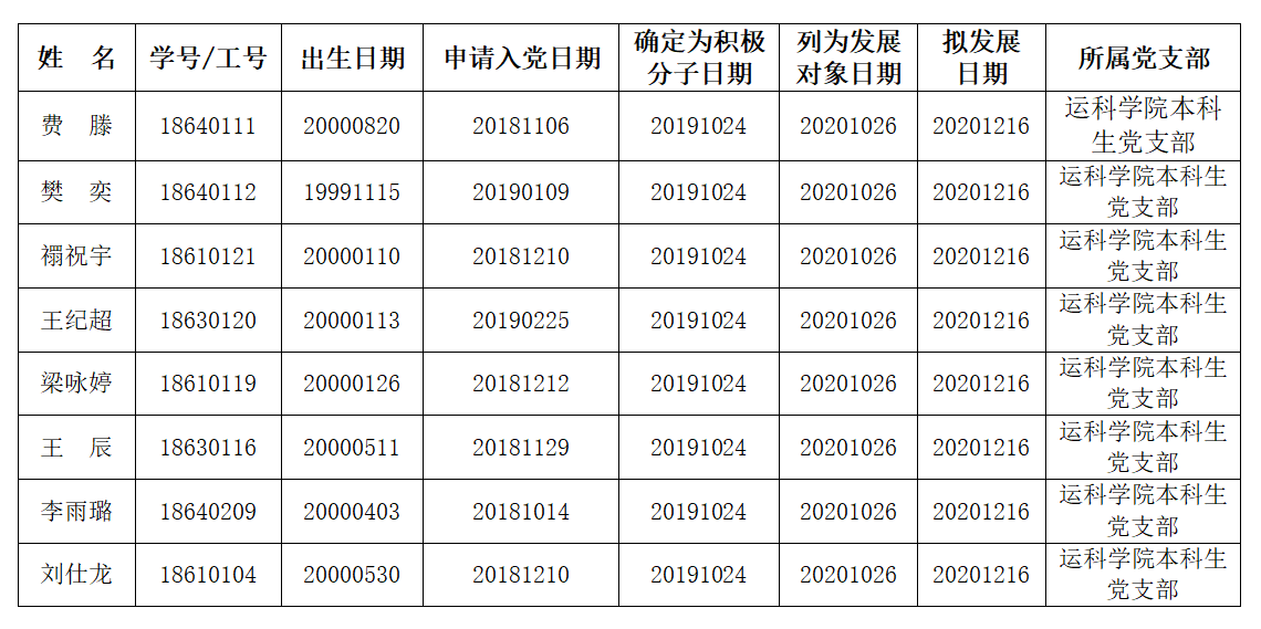 以上发展对象经过党组织的培养、教育和考察,基本符合党员条件。经党支部研究,准备发展为中共预备党员,特此公示。公示时间为七天(2020年12月7日—2020年12月13日),各单位或个人如有意见,可通过来电、来访、来函等形式反映。
