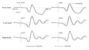 TheN170 effect was eliminated under high load condition, suggesting that attentionresources are needed for the processing of non-conscious emotional stimuli. Ourstudy provides initial evidence that perceptual load may affect the mechanismsunderlying unconscious fearful processing.