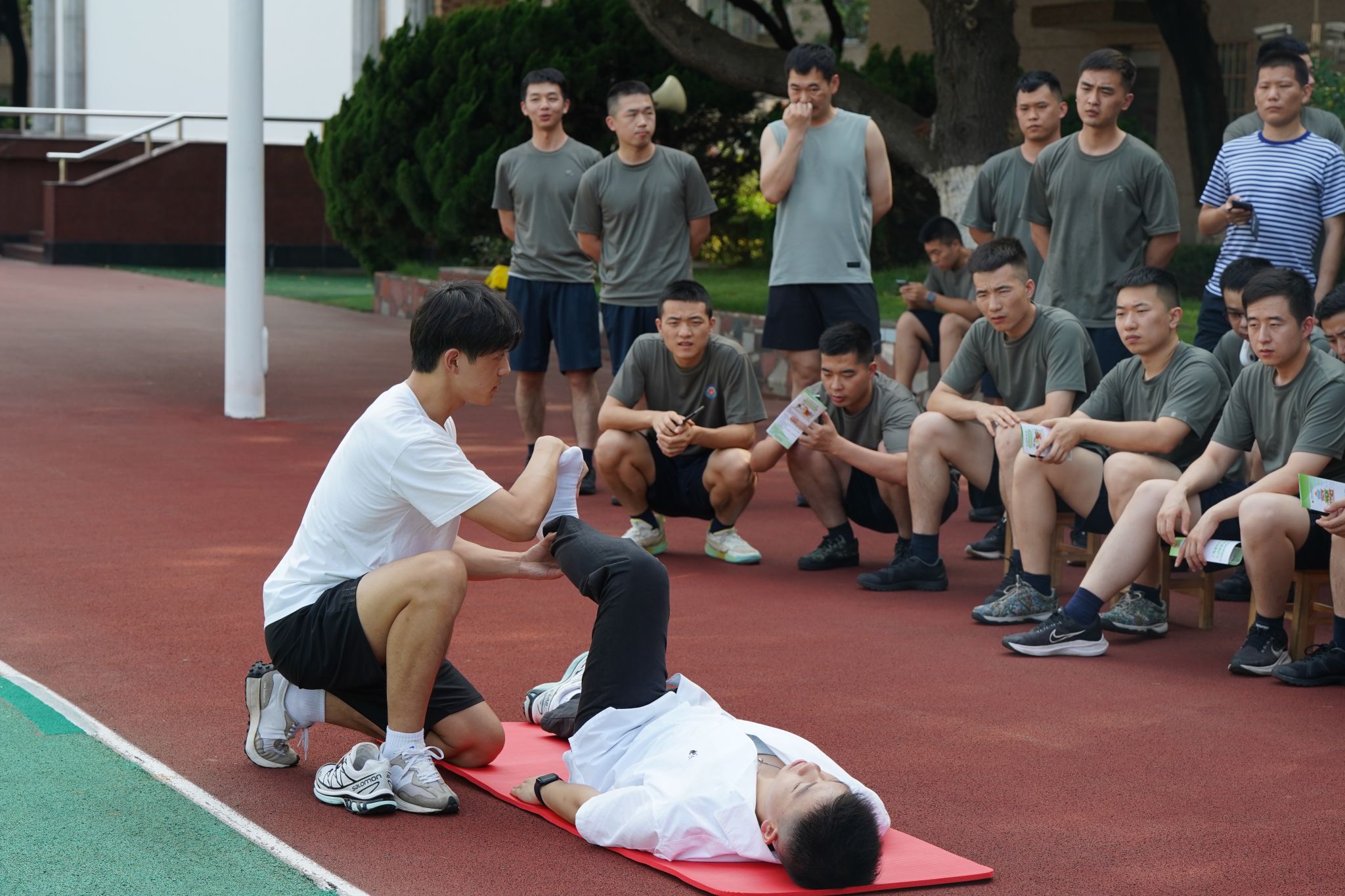 在康复义诊环节,实践队伍成员袁紫寒、李兰倩、谢一鸣等同学对国防大学的学员们进行了现场问诊与康复实操,针对膝关节积液、腰肌劳损、踝关节扭伤等常见的运动损伤问题,进行了详细的讲解,并提供和演示了可行的解决方案。现场的几位同学还分享了相关手法,让国防大学的学员们可以尝试自己进行简单的运动康复训练。