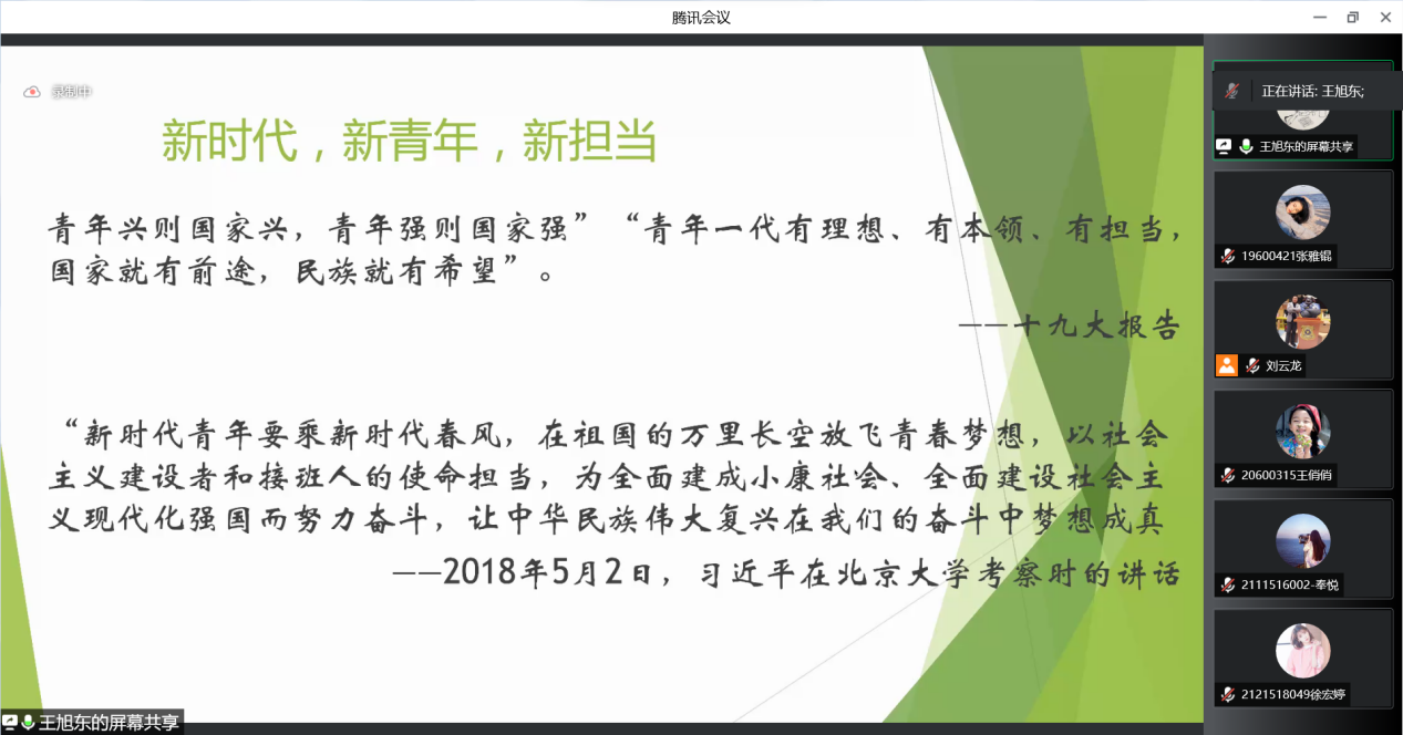 在学习中,王旭东副教授提醒学员们,青年时期对于一个人未来的发展方向有至关重要的作用,习近平总书记曾提出“青年兴则国家兴,青年强则国家”,国家提出“2035年远景目标”以及“2050年实现社会主义现代化的目标”,主力军就是学员们这一代,大家肩负着国家的前途、民族的希望。