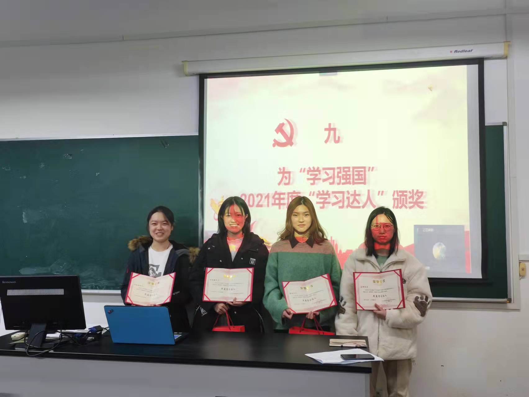 会议最后,雷越同志还对支部内“学习强国”的日常学习情况做了总结,并表彰了支部在2021年度学习积分前5名的党员同志,党支部副书记汤含雨同志为他们颁发了证书和纪念品以示鼓励。同时借此也对支部全体成员提出了鼓舞和要求,希望大家在新的一年里也要毫不放松对自己的要求,持之以恒地加强思想政治学习,不断筑牢思想之基、补足精神之钙、坚定理想信念。