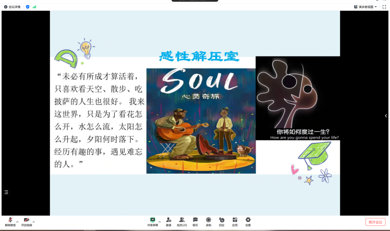 通过放映一部讲述人生目标、生活意义的电影《心灵奇旅》,让同学们在紧张的学习生活中感受一些松弛。同时希望同学们从电影中感悟到:自己应该以什么方式应对未来的生活,以及如何得到自己真正热爱的生活。