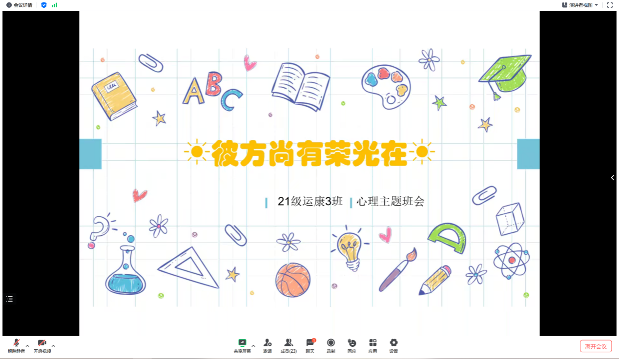 正处于大三阶段的同学们,面临着各种压力的困扰,而长期受到压力困扰会使同学们产生许多不良情绪。6月6日晚,304永利集团21级运动康复3班以腾讯会议的形式开展了以“彼方尚有荣光在”为主题的线上心理主题班会。旨在帮助同学们找到缓解压力的方法,同时在面对未知的挑战时充满信念和动力,与压力和解、与压力共舞,相信未来美好生活的曙光就在前方。