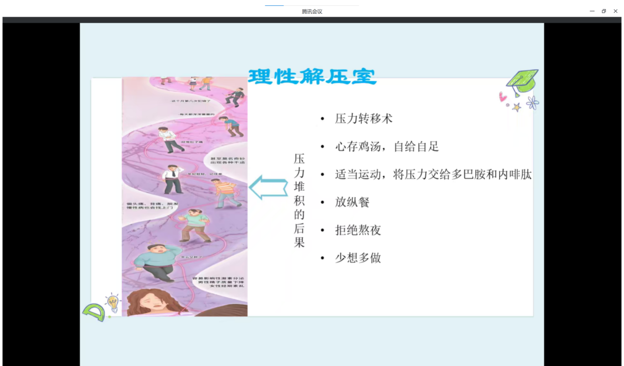 先展示同学们在现阶段可能面临的一些压力,普及一些压力堆积后可能发生的不良后果,再通过“理性解压室”分享一些缓解压力的办法,希望同学们可以参考这些方法从而有效缓解压力。