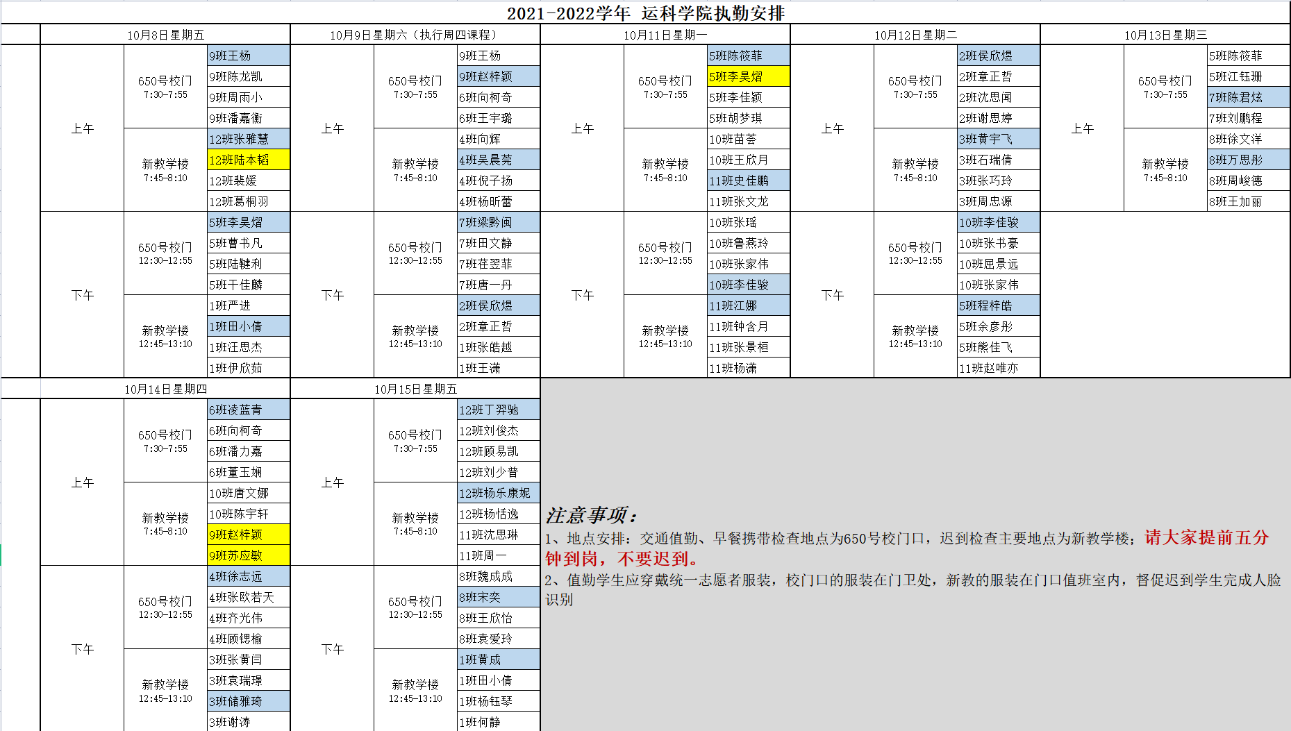 2021-2022学年第一学期运科公司学风执勤排班表