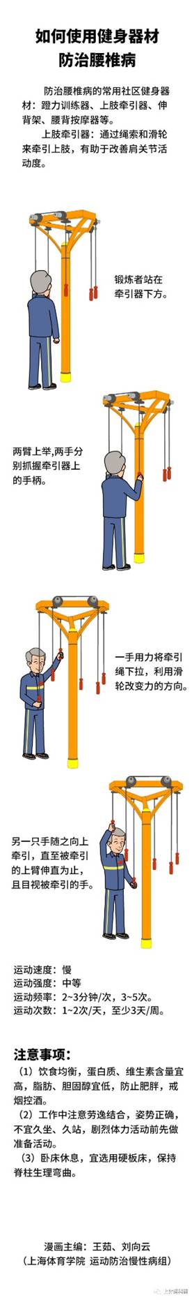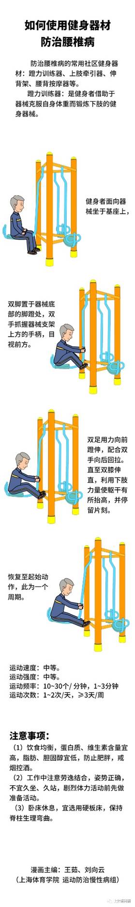 防治腰椎病的常用社区健身器材:蹬力训练器、上肢牵引器、伸背架、腰背按摩器等。